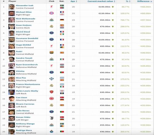 2025年身价上涨榜:伊萨克奥利塞飙升6500万欧,登贝莱涨4500万欧