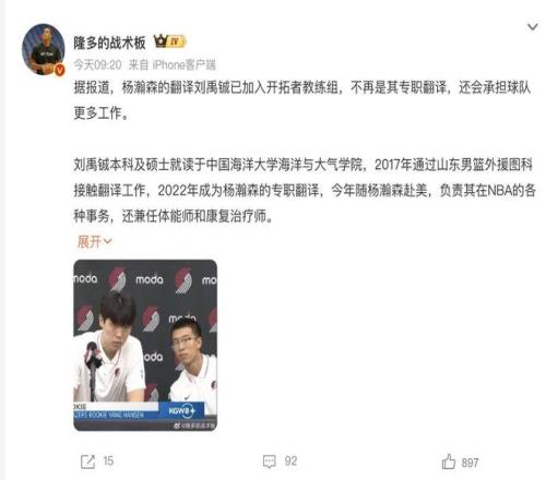 同时对于杨瀚森来讲,其翻译刘禹铖不管是否加入开拓者教练组,对杨瀚森来说都是好事,其实也是对他的勉励和敲打。两个人同时来到NBA,似乎刘禹铖要比杨瀚森更快站稳脚跟。除了自身实力之外,私下的努力和融入也是不容忽视的,这也给杨瀚森敲响警钟,被选中不意味着能够留下来,你不努力,有人比你更努力!