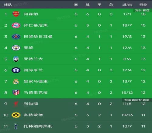欧冠第6轮结束了所有比赛,最新积分榜如下!