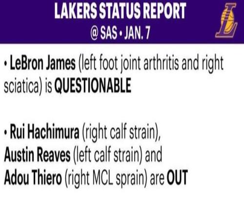 不过在湖人官方更新的他们周四客战马刺的伤情报告中,詹姆斯因为左脚关节炎和右坐骨神经痛被列为出战成疑。此外,八村垒(右小腿拉伤)、里夫斯(左小腿拉伤)以及阿杜-蒂埃罗(右膝内侧副韧带扭伤)仍将因伤缺阵。