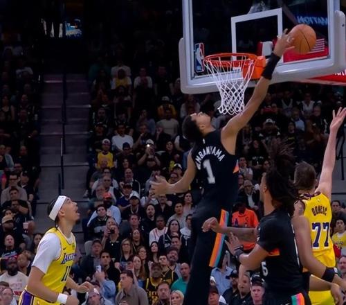 次节回来,斯玛特调高弧线超级高抛,仍旧被文班亚马暴跳没收,这还怎么打?卡特-布莱恩特突破抛投擦板命中,马刺领先到7分。东契奇连续造犯规罚球命中,随后送出本场第7次助攻,助力拉拉维亚连中两记三分,湖人打出一波11-0反超马刺4分。东契奇己方底线拿球,就遭遇马刺双人包夹,尚帕尼冲击篮筐裁判吹海斯犯规,雷迪克果断挑战,最终成功改判。凯尔登勾手命中后,再强突篮下打成2+1,马刺重新取得领先优势。东契奇传球失误,凯尔登反击追身三分还能还能投进,近期状态真是好,半场战罢,马刺48-43领先湖人5分。
